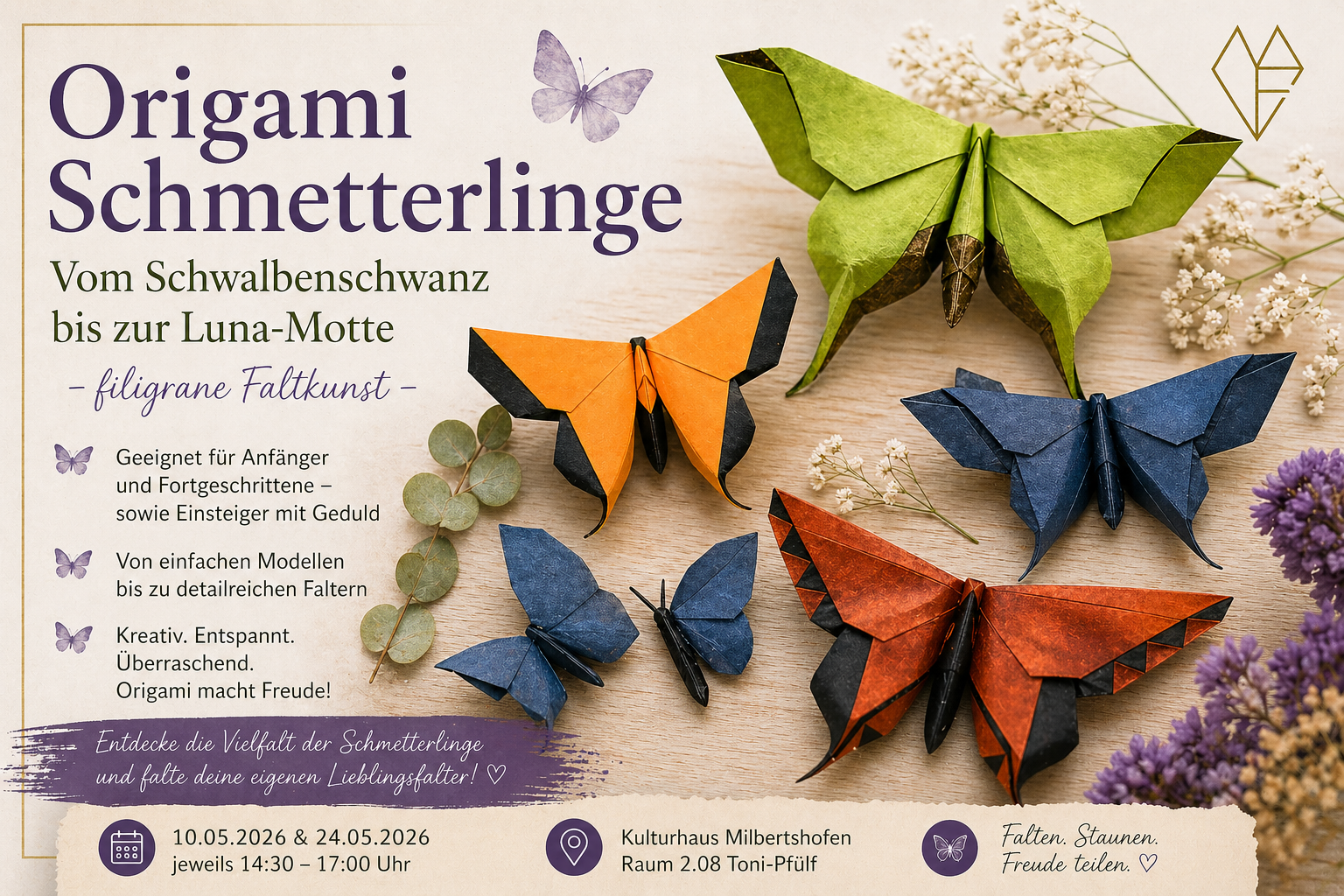Im Mai widmen wir uns ganz der Welt der Schmetterlinge. Gefaltet werden verschiedene Modelle – darunter der elegante Schwalbenschwanz,